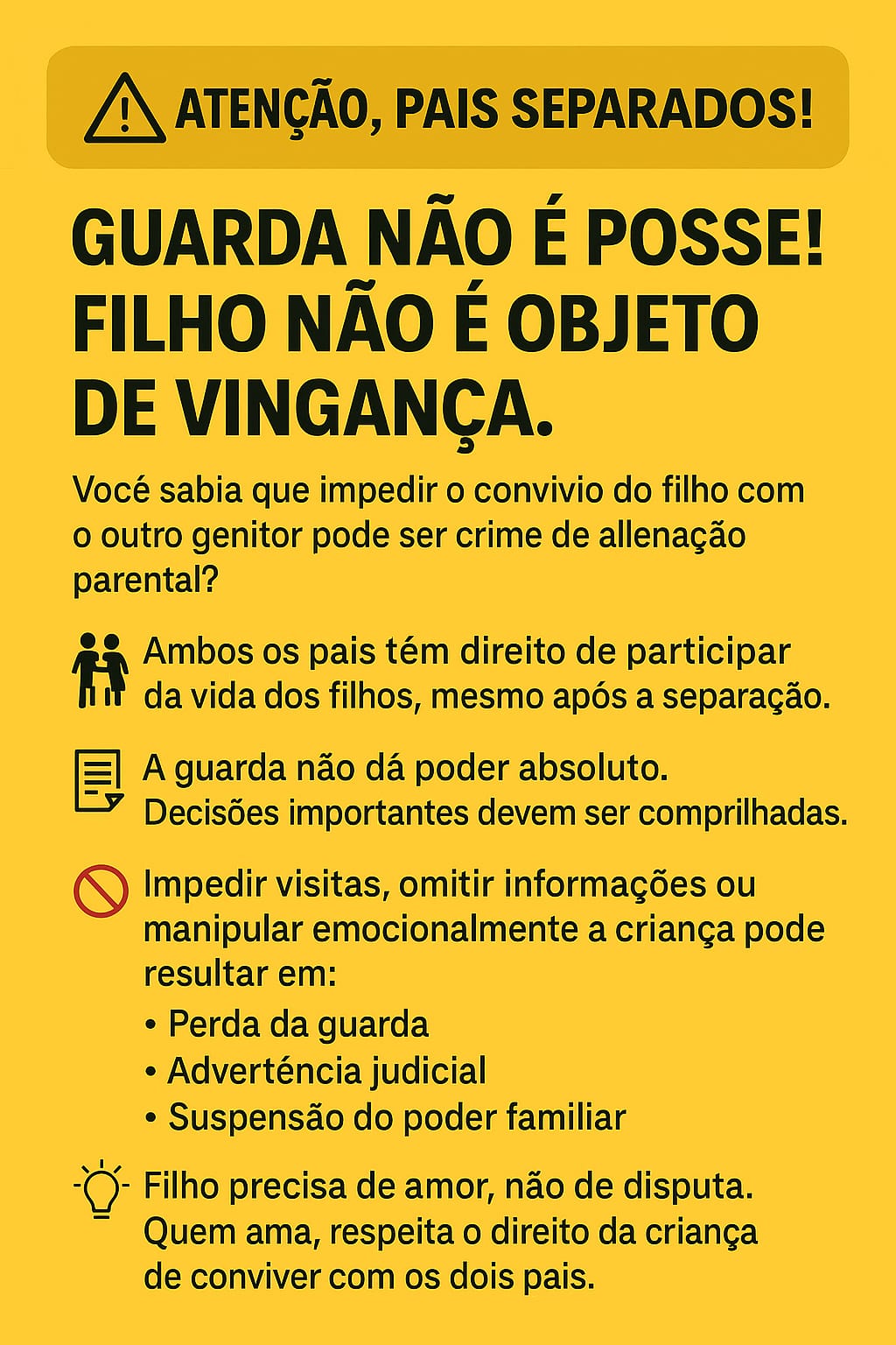 A guarda não pode e não deve ser usada como ferramenta de poder ou retaliação. Quem age dessa forma, além de comprometer o bem-estar do próprio filho, infringe a lei e corre sérios riscos jurídicos. Filho não é objeto de disputa: é sujeito de direitos. E um dos seus direitos mais fundamentais é amar e conviver com ambos os pais.
