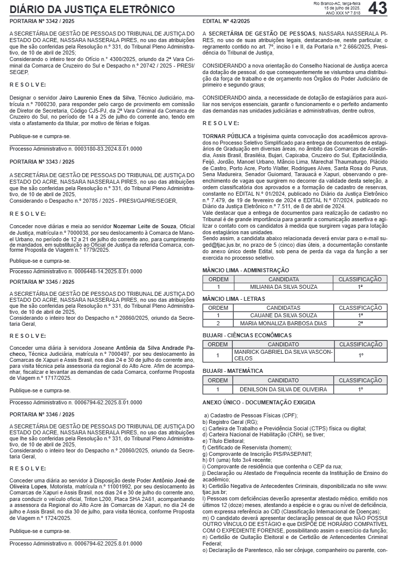 O Tribunal de Justiça do Acre (TJAC), por meio da Secretaria de Gestão de Pessoas, publicou nesta terça-feira, 15, o Edital nº 42/2025, convocando acadêmicos aprovados no seletivo simplificado para estágio nas comarcas do estado.